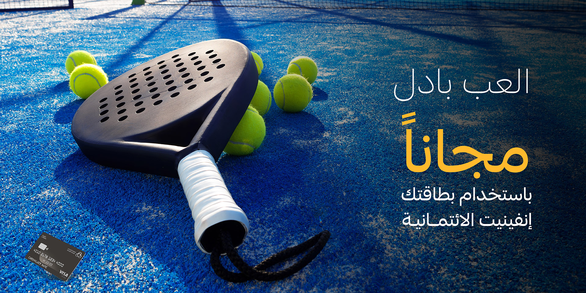استمتع بتجربة لعب البادل مجاناً وبدون أي تكاليف في أرقى الأندية والملاعب مع بطاقات مصرف الراجحي بلاك كارد وإنفينيت الائتمانية.