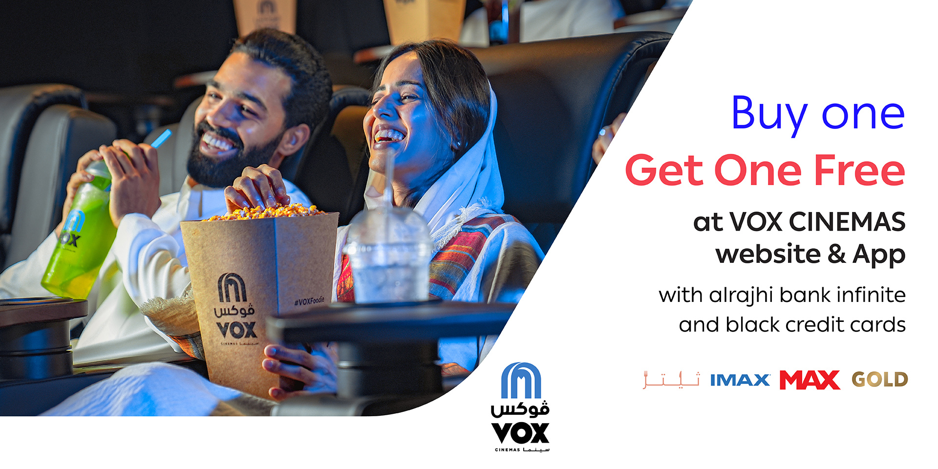 Buy ticket and get the second one for free at VOX CINEMAS App and website With alrajhi bank Infinite credit cards.