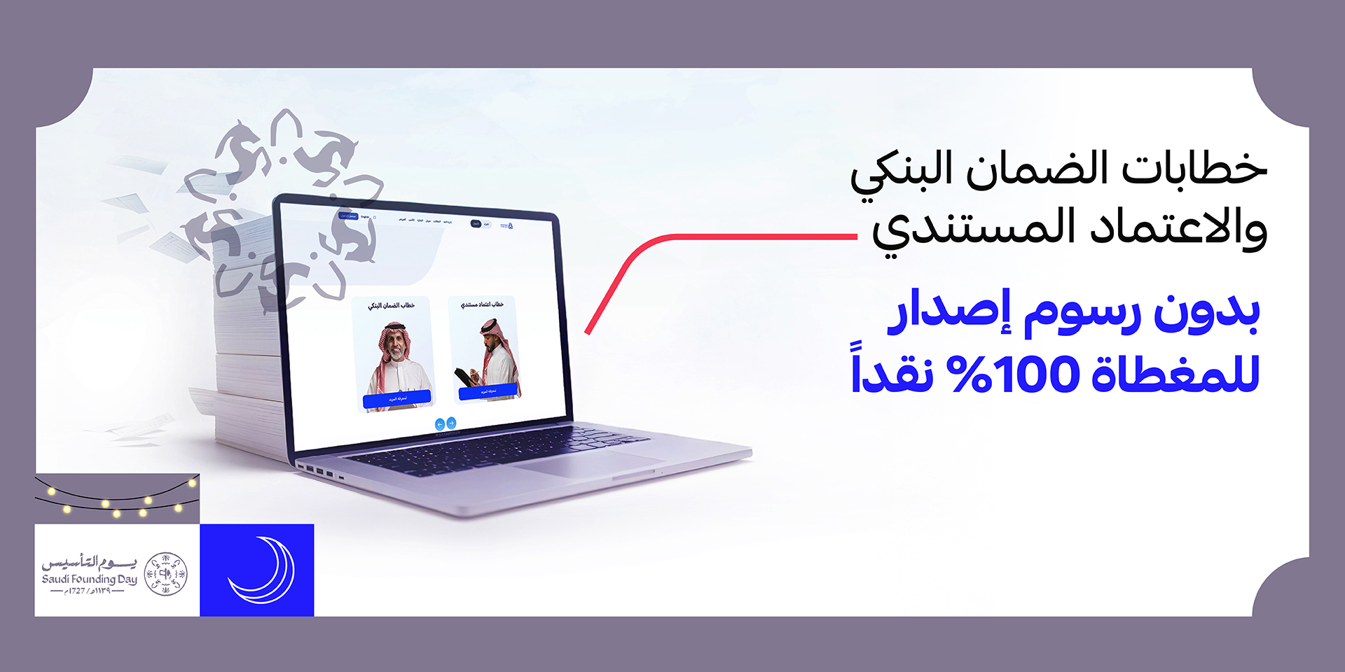 بمناسبة يوم التأسيس السعودي , ضمانك البنكي أو اعتمادك المستندي المغطى نقدا 100% ، بدون رسوم إصدار ولفترة محدودة قدّم الآن ولا تفوّت الفرصة!