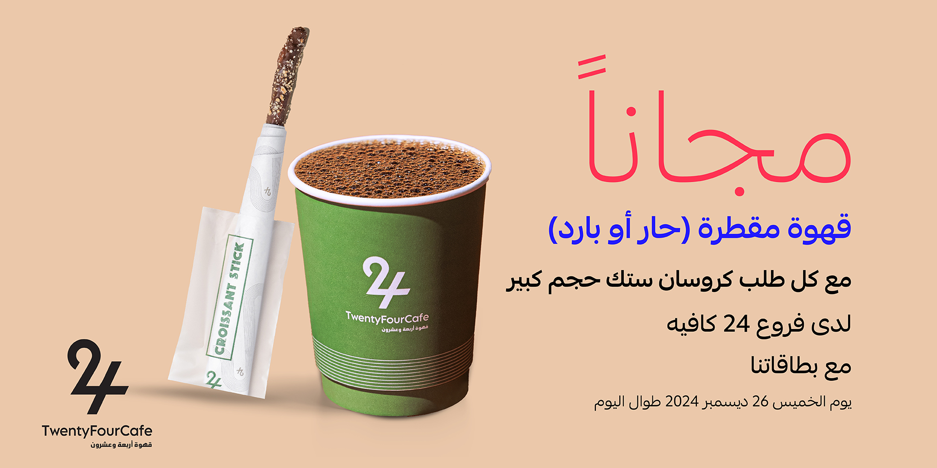 احصل على قهوة مقطرة مجانا عند شراء كروسان ستك حجم كبير لدى 24Cafe