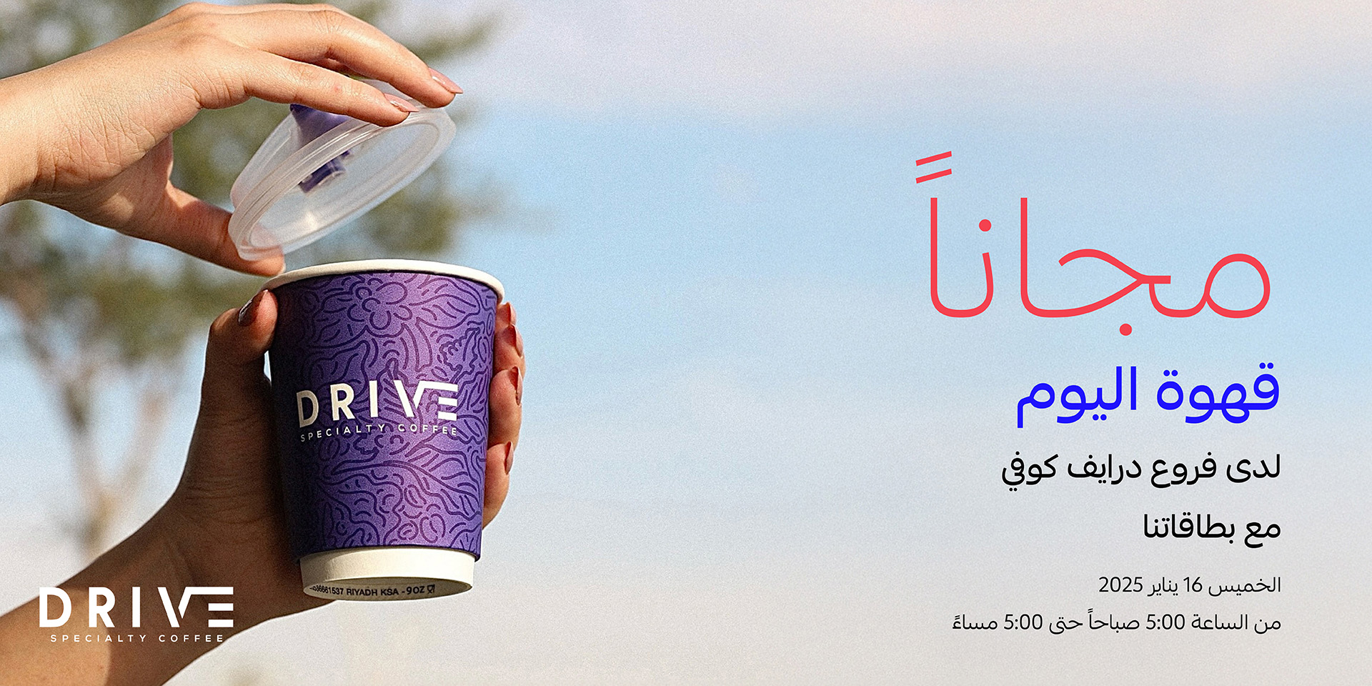 • احصل على كوب قهوة اليوم بالحجم العادي مجانا من درايف كوفي