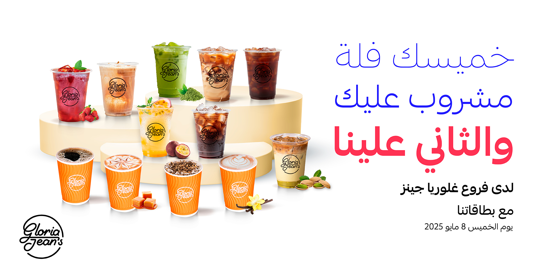 - اشتري أي مشروب ساخن أو بارد واحصل على المشروب الثاني مجانًا لدى فروع جلوريا جينز