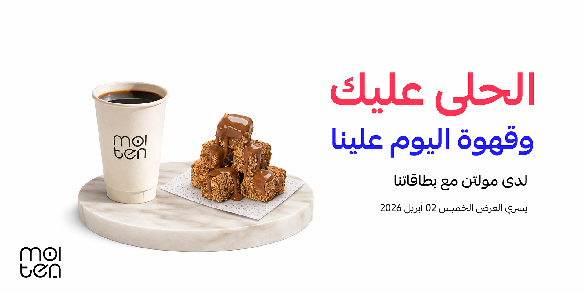 - اشتر أي نوع حلى وأحصل على قهوة اليوم مجاني حارة أو باردة من مولتن