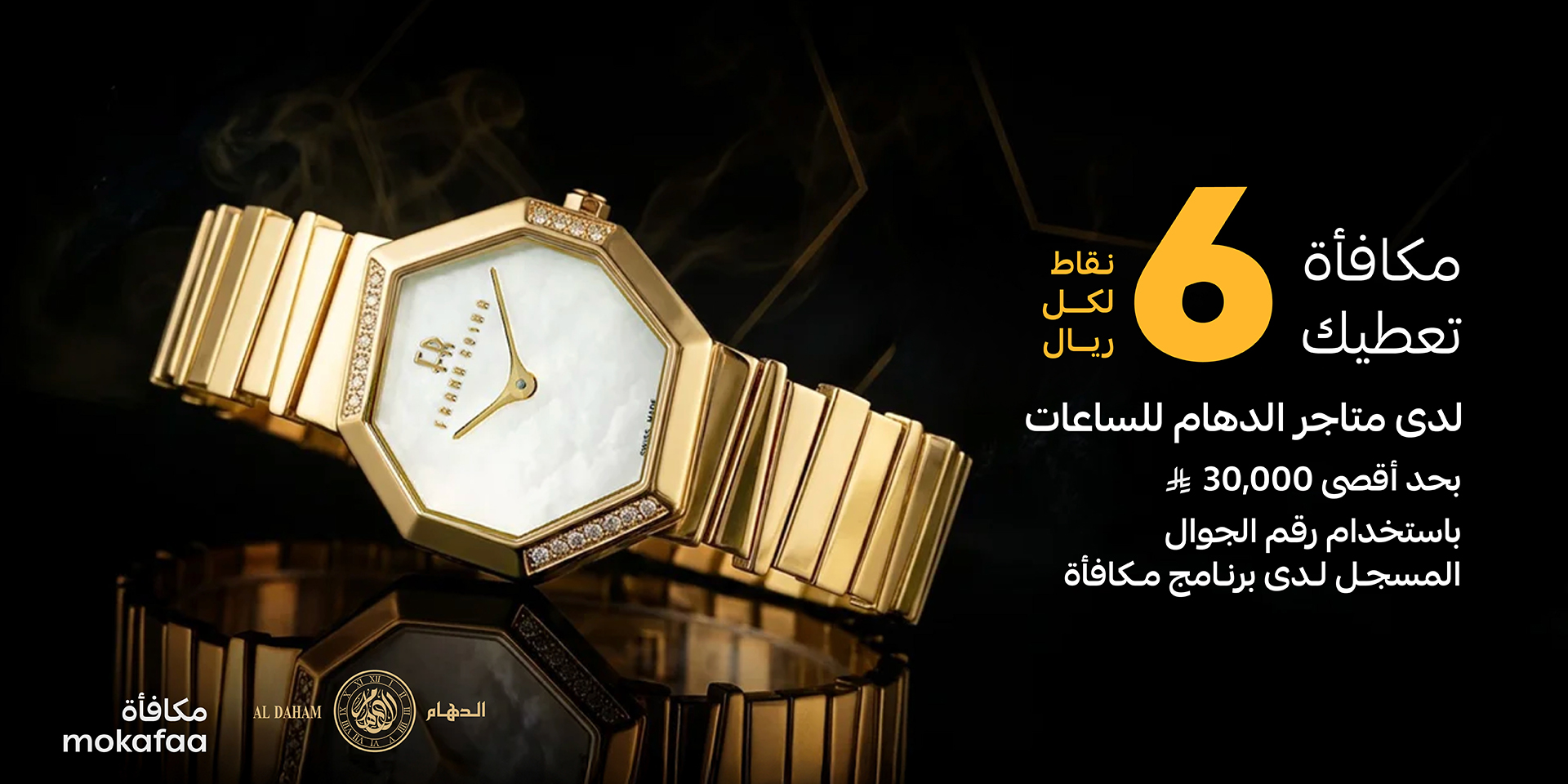 - ستحصل على 6 نقاط مكافأة لكل 1 ريال على العمليات الشرائية من خلال متاجر الدهام للساعات