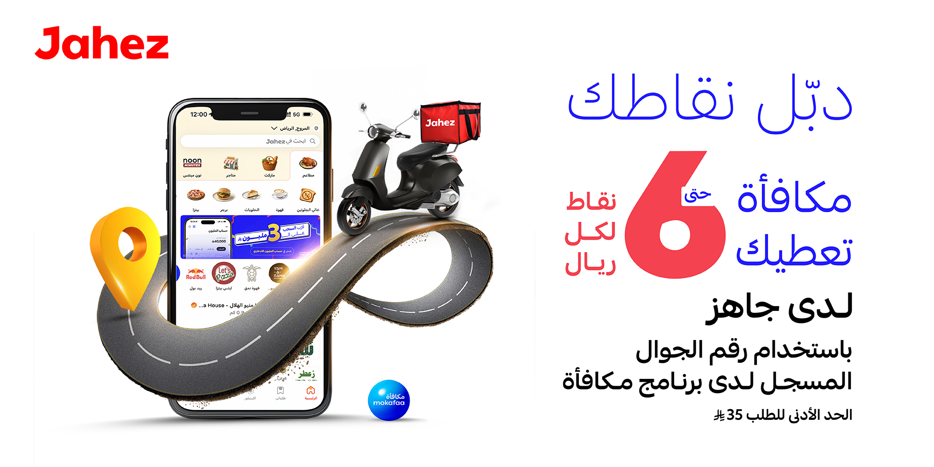 - اكسب حتى 6 نقاط مقابل كل 1 ريال يتم صرفه في تطبيق جاهز: (عند طلب بقيمة 35 ريال كحد أدنى حتى 99 ، يكسب العميل على نقطتين لكل 1 ريال) ، (عند طلب بقيمة 100 ريال حتى 149 ، يكسب العميل على 4 نقاط لكل 1 ريال) ، (عند طلب بقيمة 150 ريال أو أكثر، يكسب العميل على 6 نقاط لكل 1 ريال).