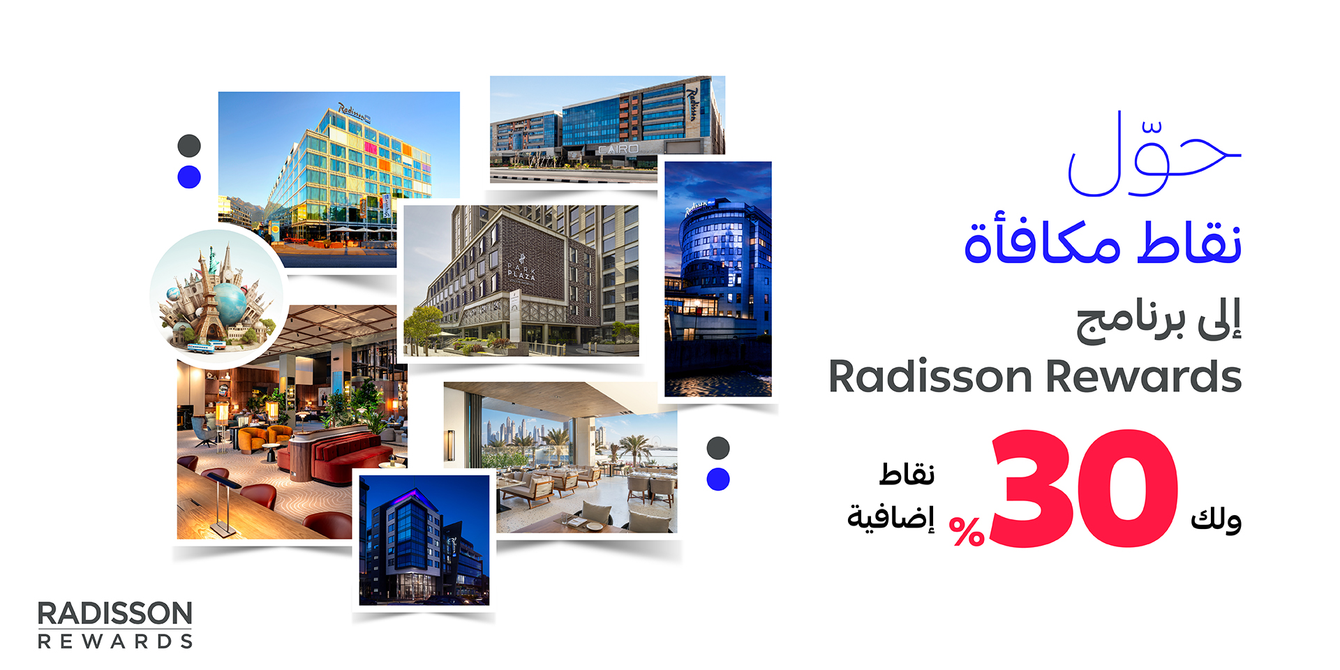 - حول نقاط مكافأة إلى Radisson Rewards وسوف تحصل على 30% نقاط إضافية من إجمالي النقاط المحوّلة في العملية الواحدة. (مثال: بدلاً من اكتساب 2,000 نقطة Radisson Rewards مقابل 10,000 نقطة مكافأة، ستحصل على 2,600 نقطة Radisson Rewards)