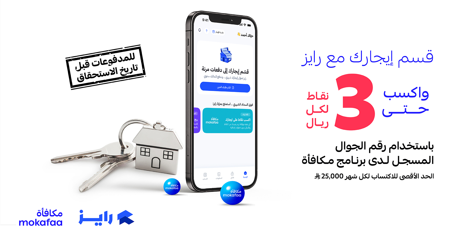 اكسب حتى 3 نقاط مكافأة مقابل كل 1 ريال يتم سداده من خلال تطبيق و موقع رايز.