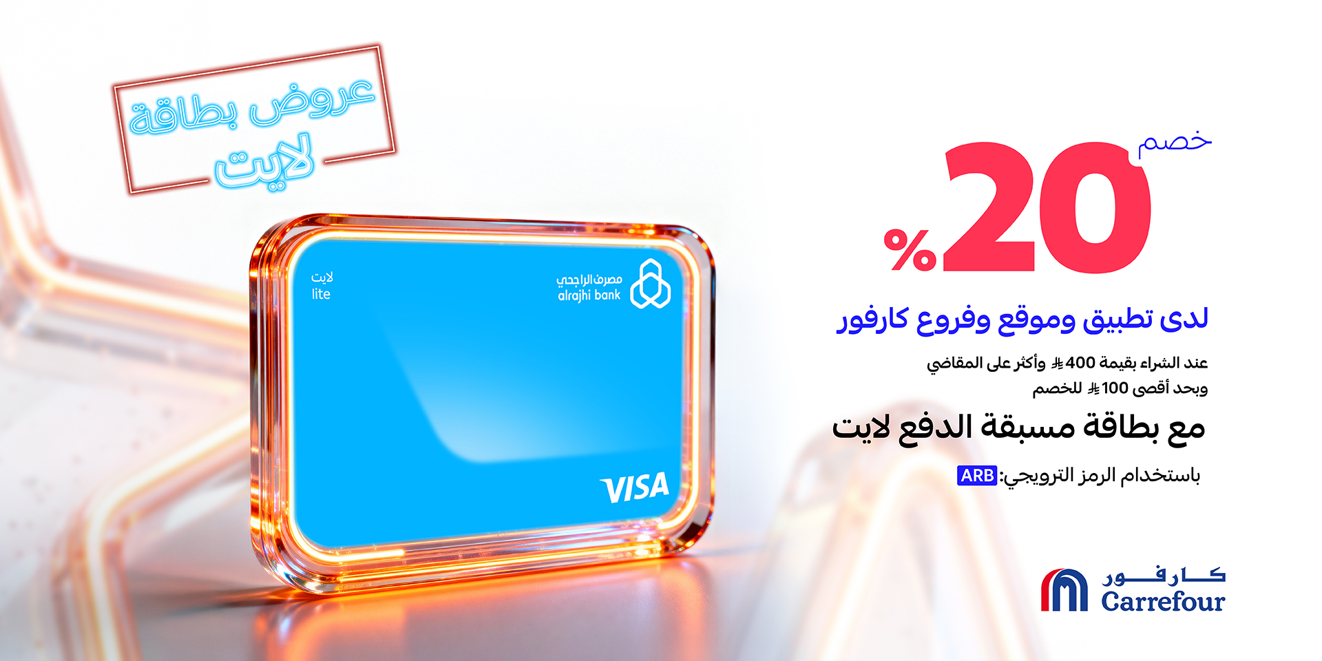 استمتع ب 20% خصم عند إنفاق 400 ريال أو أكثر على مشتريات المواد الغذائية لدى تطبيق وموقع وفروع كارفور عند استخدام بطاقة لايت!