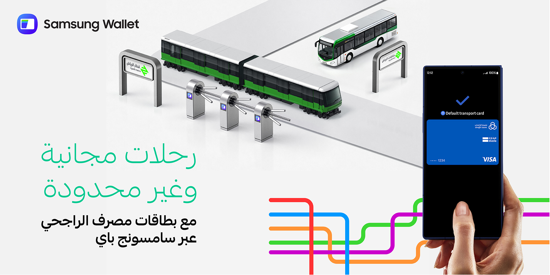 رحلات مجانية وغير محدودة على مترو الرياض لمدة أسبوع كامل حصريًا عند استخدام بطاقات مدى و بطاقات الائتمان ومسبقة الدفع من مصرف الراجحي عبر سامسونج باي.