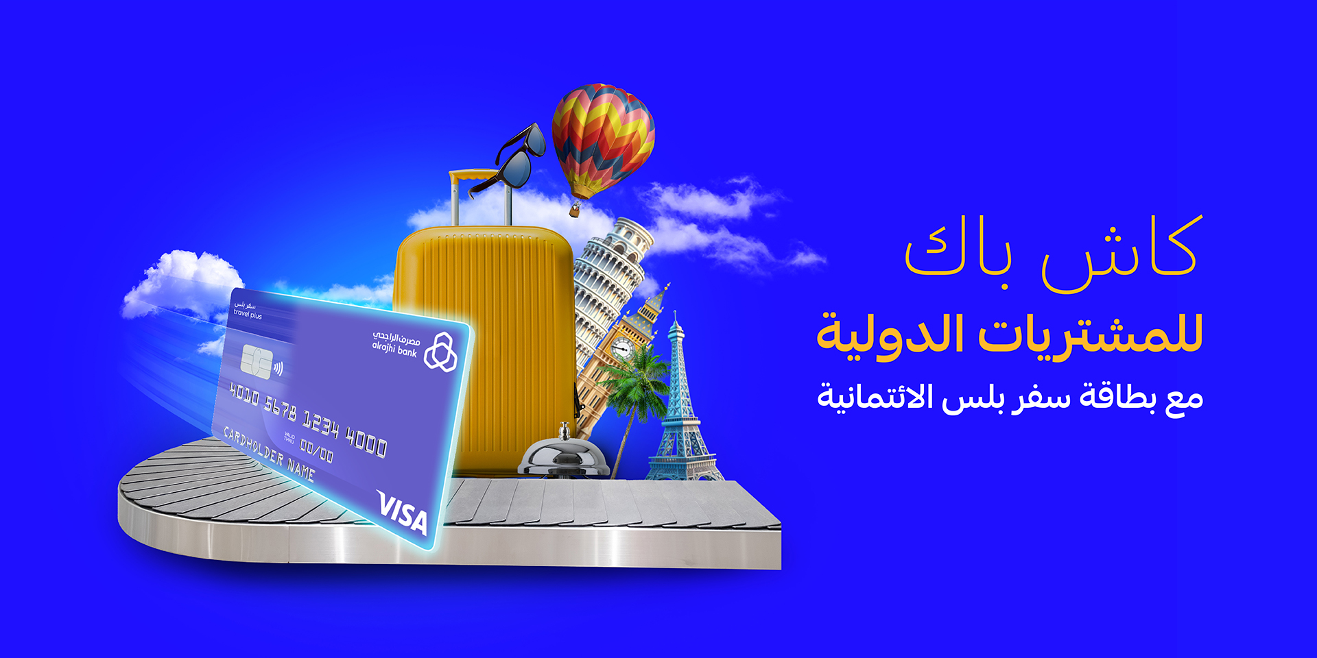 احصل استرداد نقدي على جميع مشترياتك الدولية أثناء سفرك خارج المملكة أو عند التسوق الإلكتروني عند استخدام بطاقتك سفر بلس من مصرف الراجحي.