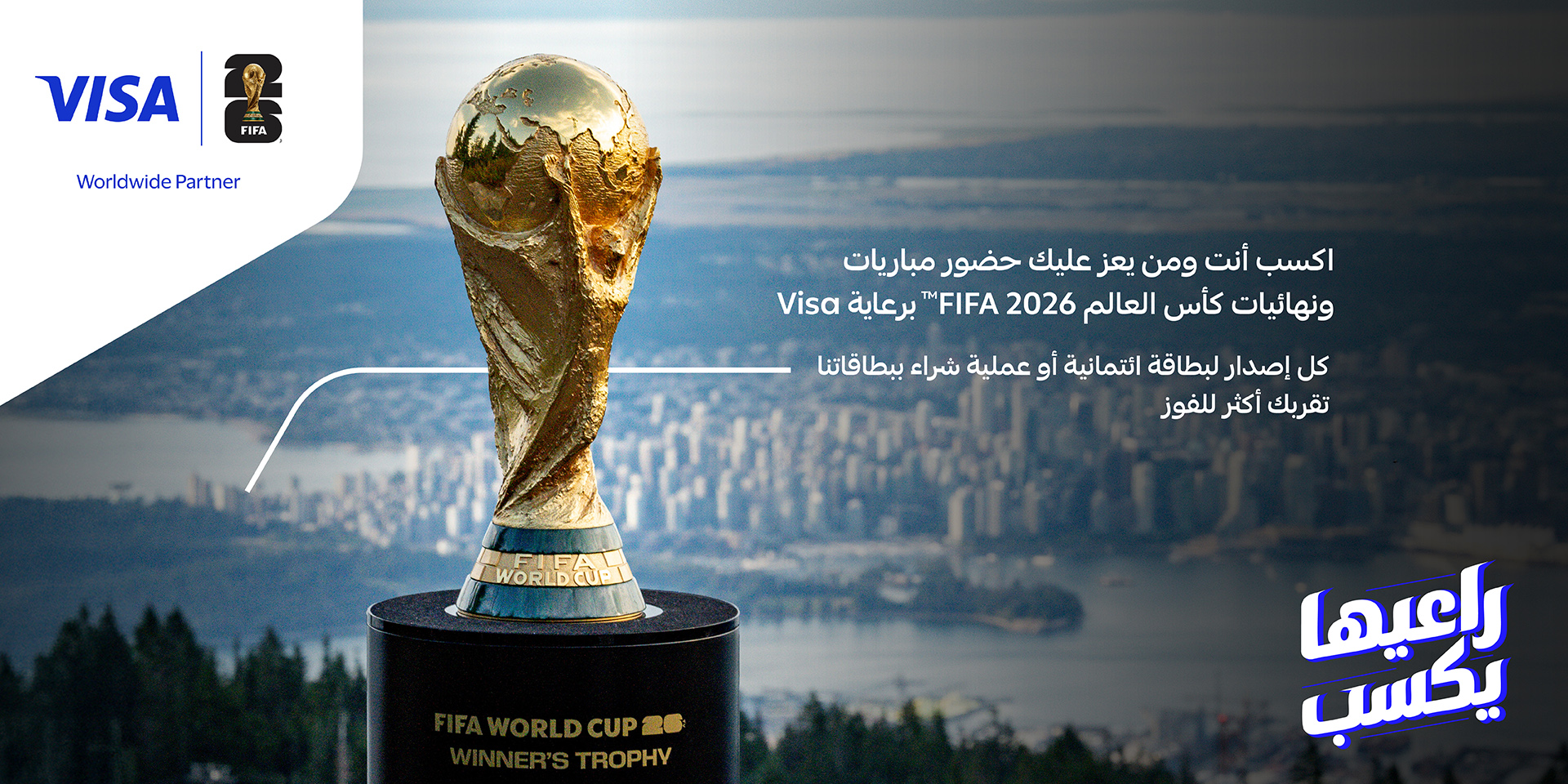 استخدم بطاقة مصرف الراجحي الخاصة بك أو تقدّم بطلب للحصول على بطاقة ائتمانية من مصرف الراجحي للدخول في السحب للفوز بإحدى 40 باقة سفر شاملة لشخصين لحضور مباريات كأس العالم FIFA 2026™، المقدمة من فيزا