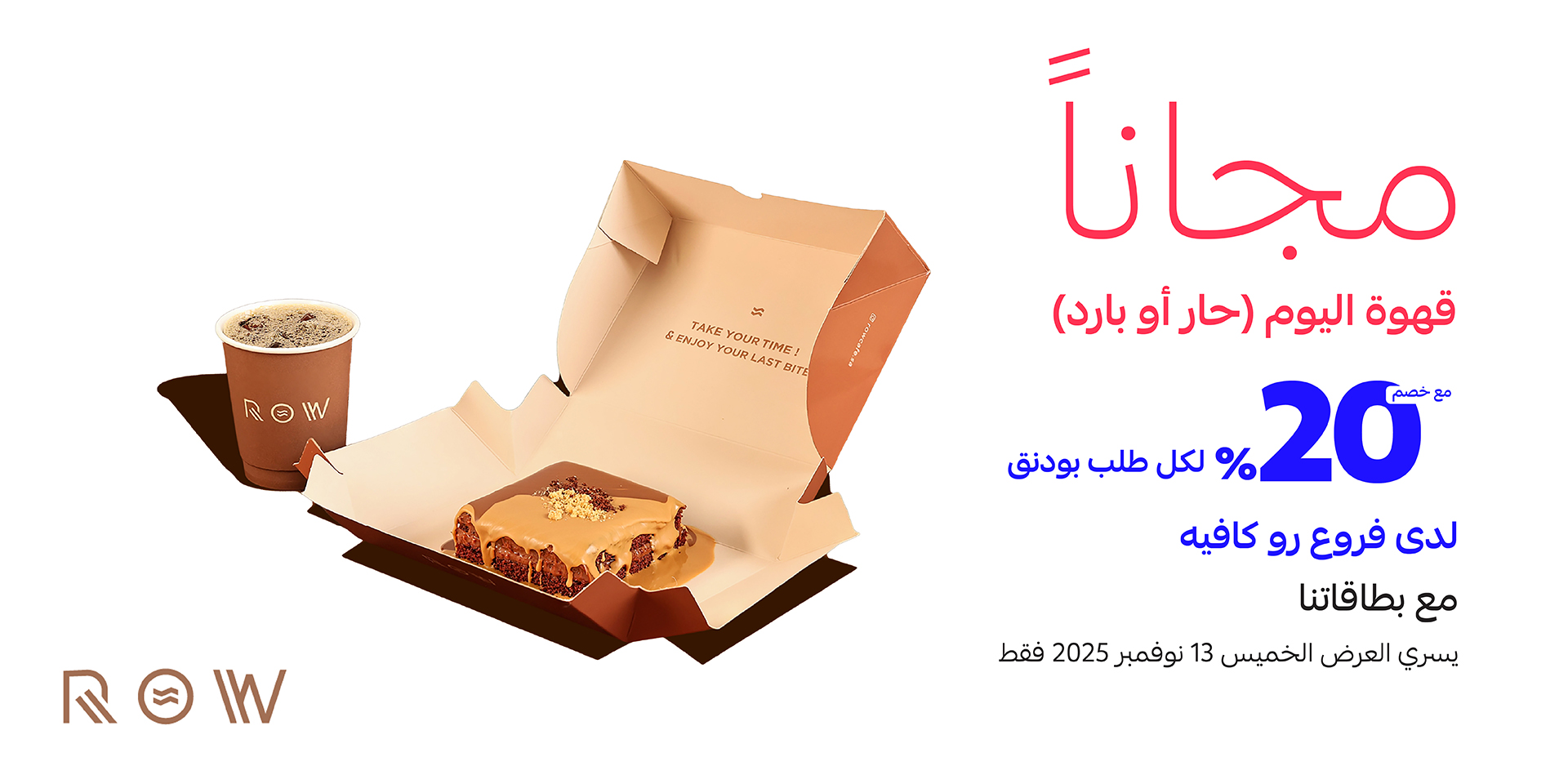 - خصم %20 على البودنق + قهوة اليوم صغير مجانا "للعميل الحق في اختيار سواء بارد او ساخن في فروع رو كافية”