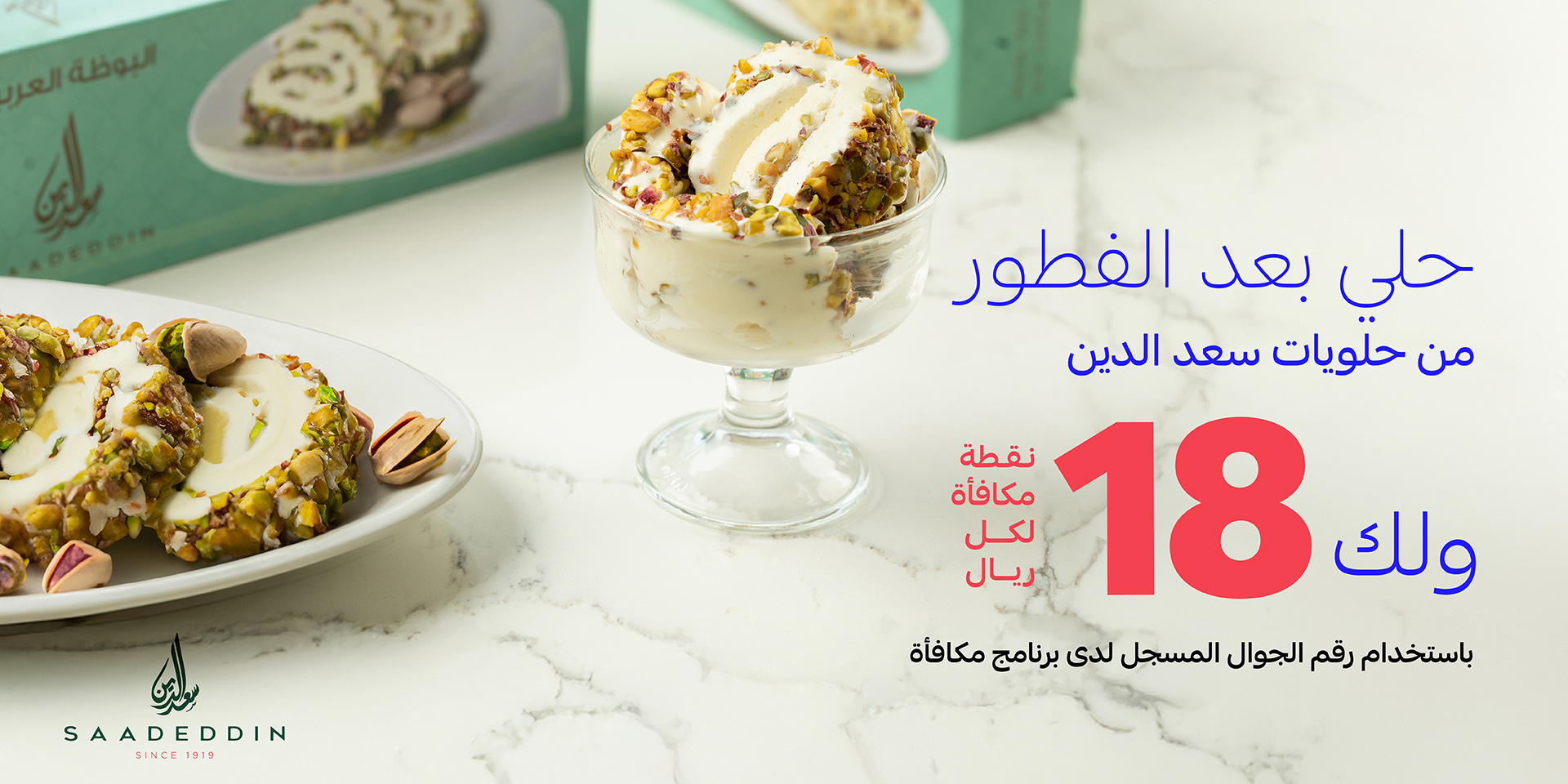 الآن مكافاة تعطيك 18 نقطة لكل1 ريال تدفعه لدى حلويات سعد الدين باستخدام رقم الجوال الخاص بك والمسجل لدى برنامج مكافأة!