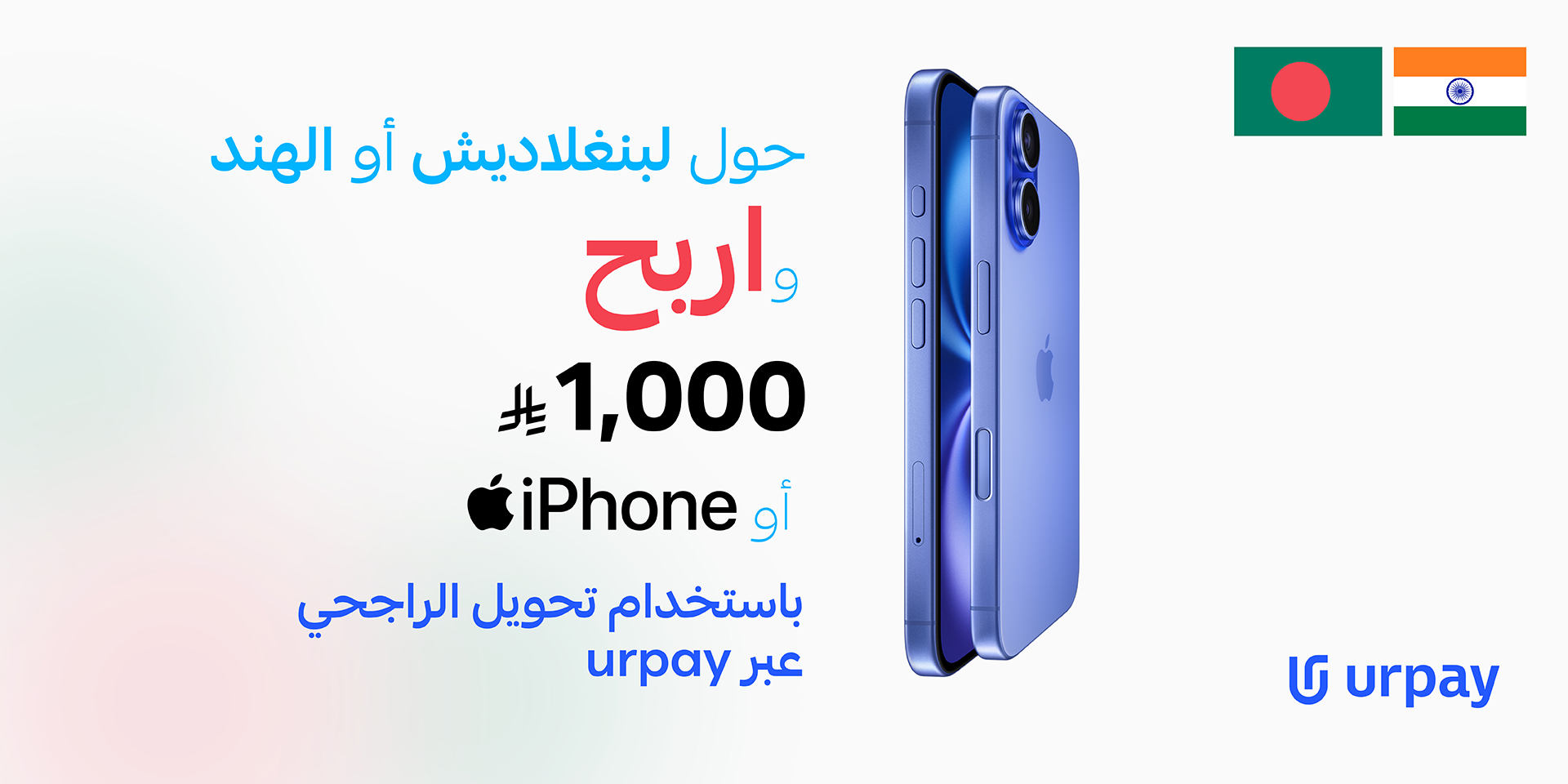 حول للهند او بنغلادش باستخدام تحويل الراجحي عبر urpay وادخل السحب على 1,000 ريال او ايفون 16!