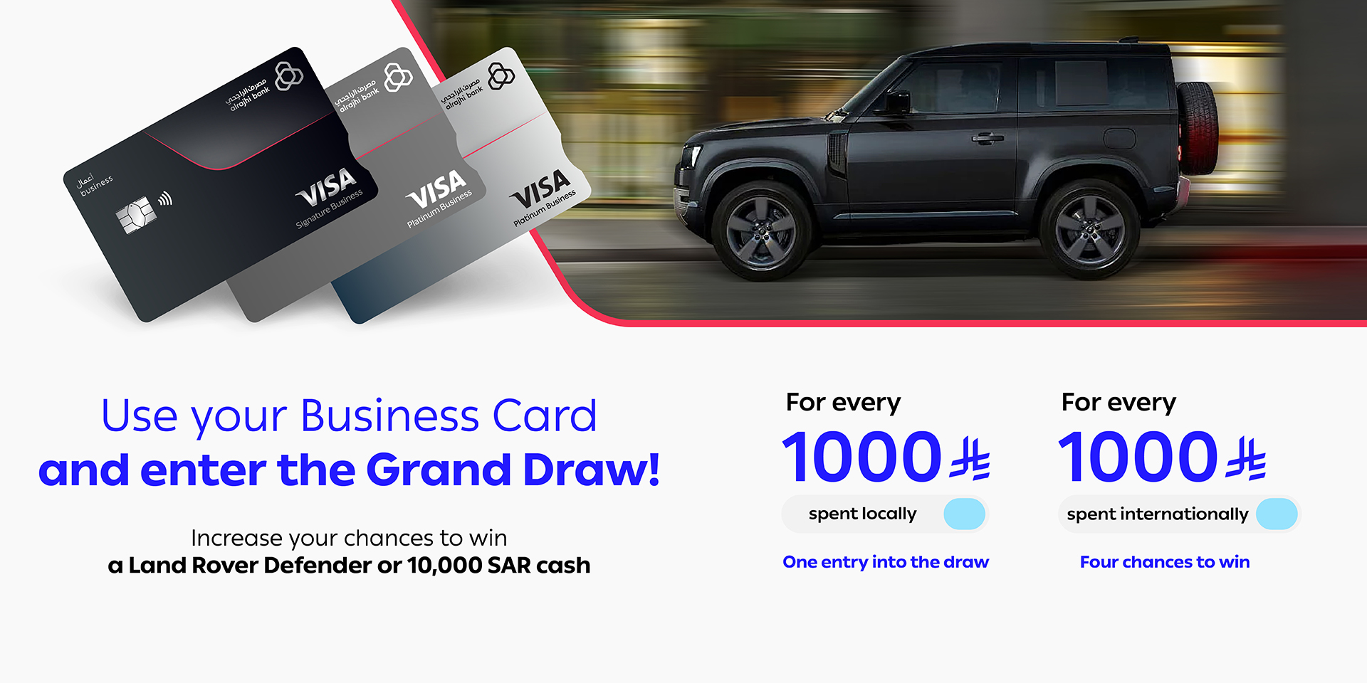 - Clients will earn draw entry as follows: (Existing cards with no block will get 1 entry as a default) , (New acquisition and/or cards spend activated during the campaign period: [10 entries on first spend using a Business Credit Card] ,[1 entry on first spend using a Business Prepaid Card] .) , (4 entries for every 1,000 SAR of international spend) , (1 entry for every 1,000 SAR of local spend).