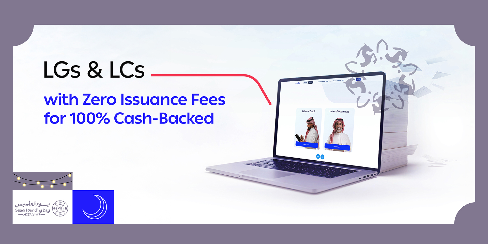 In celebration of the Saudi Foundation Day, get your LGs & LCs, 100% cash-covered, with no issuance fees and for a limited time. Apply now and don’t miss the opportunity!