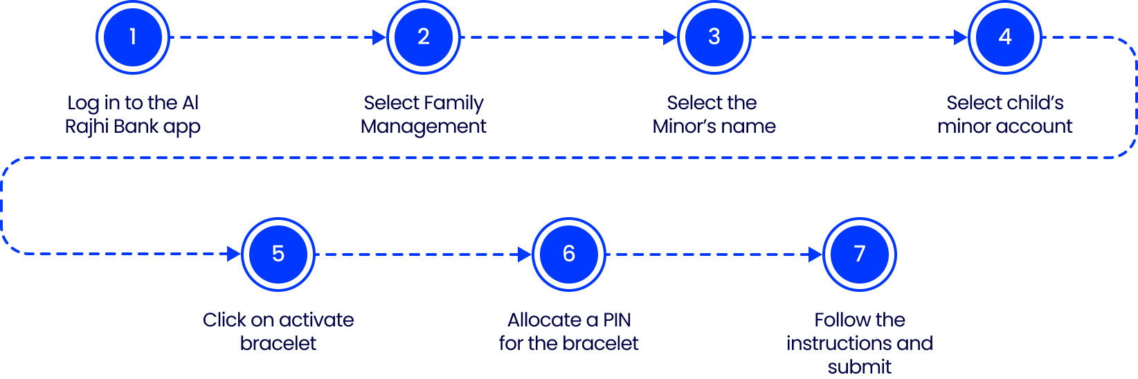 This bracelet operates similarly as the Alrajhi bank mada card for dependent accounts, as it is linked to the current account, allowing parents to control and monitor it.
