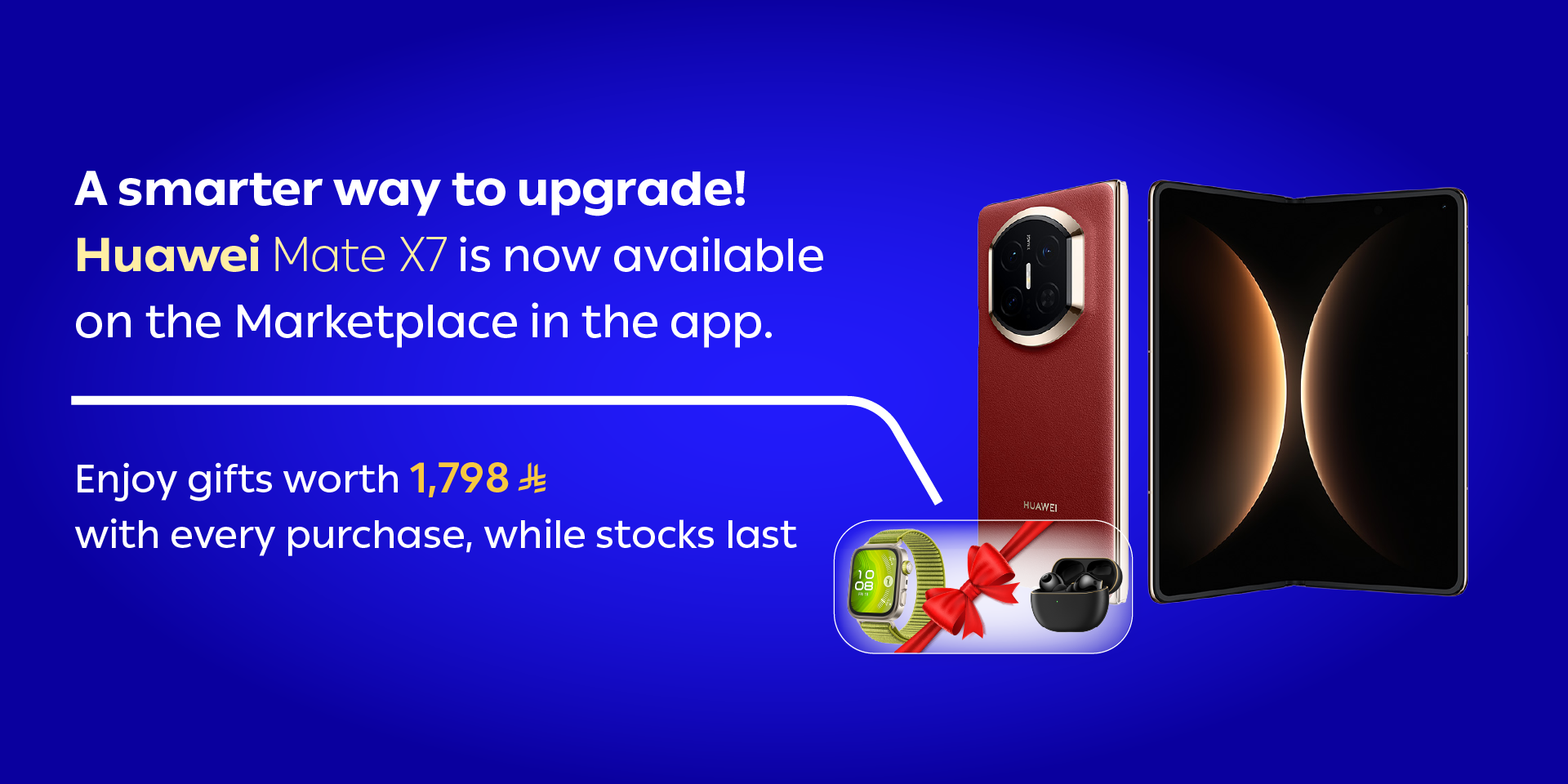 Gifts worth SAR 1,798 (Black HUAWEI FreeBuds Pro 4 Earbuds + Green HUAWEI WATCH FIT 4 Series) with every purchase HUAWEI Mate X7