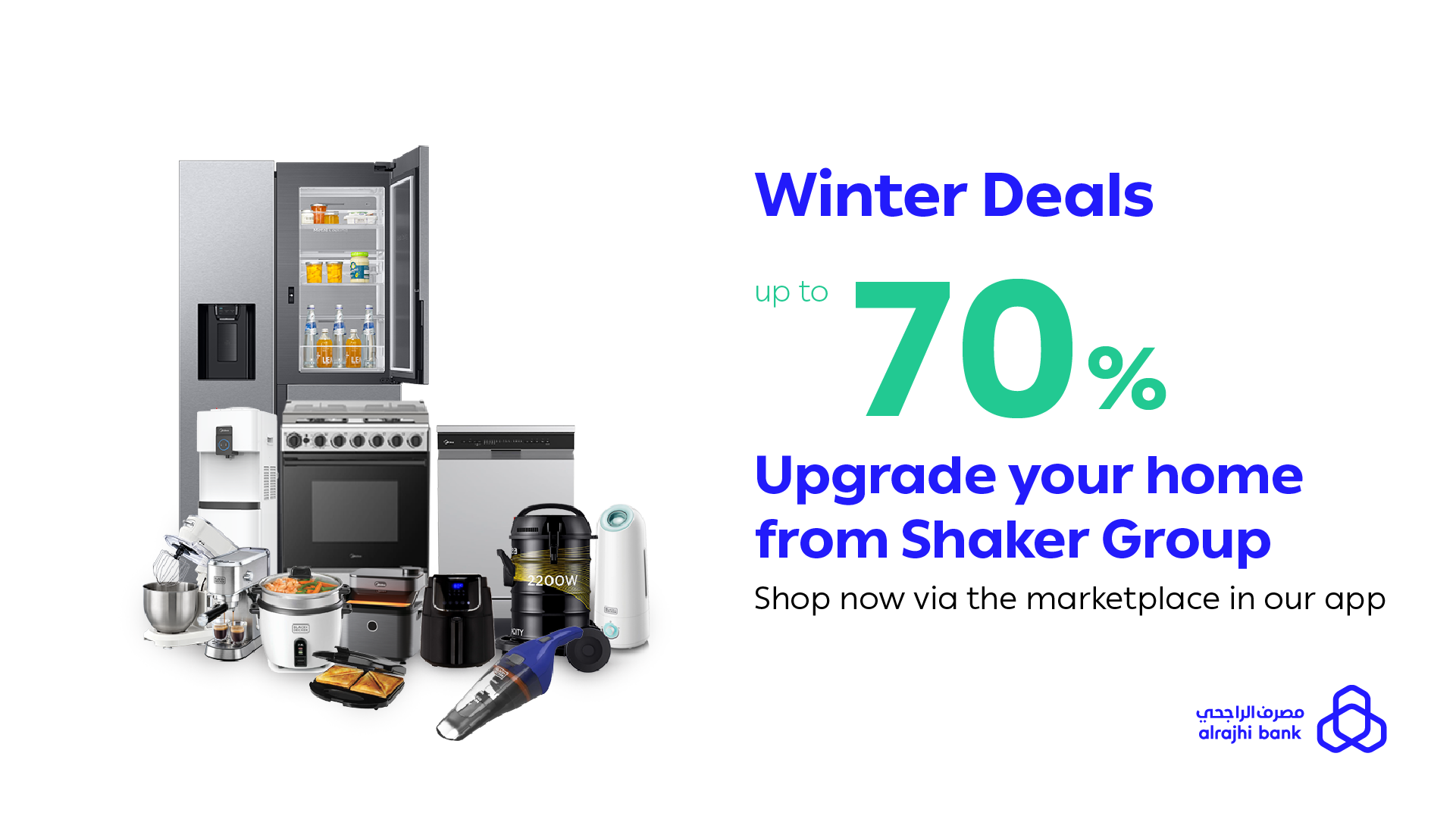 - Get up to 70% off when purchasing Shaker Group products from the marketplace on the alrajhi bank app
