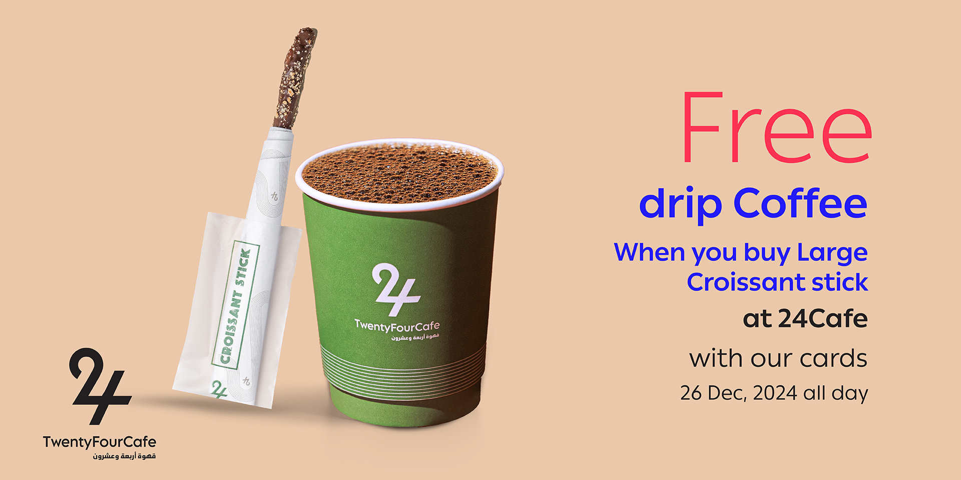 Get Free drip Coffee when you buy large Croissant stick at 24Cafe