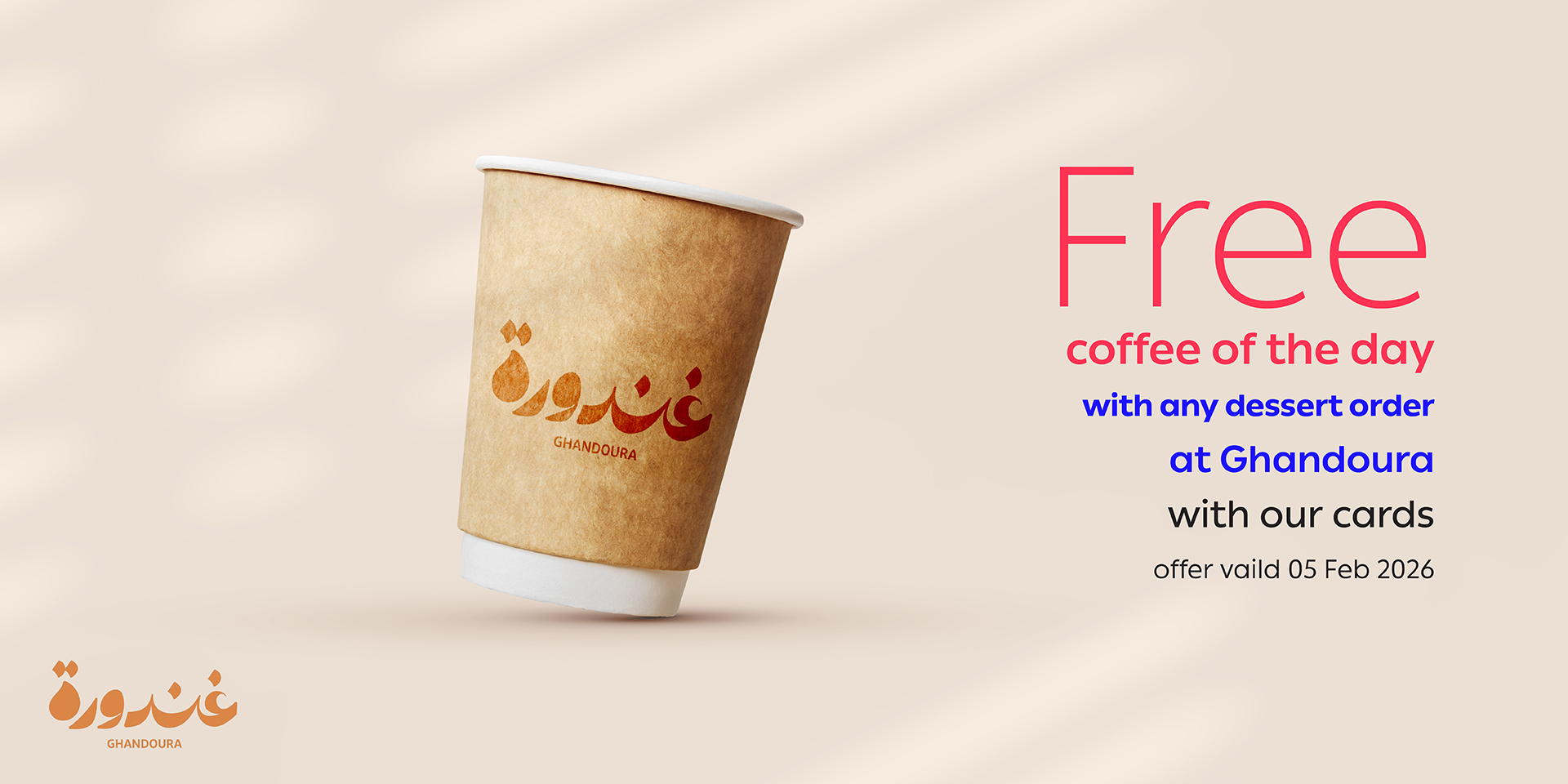 - Buy any dessert and get small coffee of the day (hot or ice) for free in Ghandoura stores.
