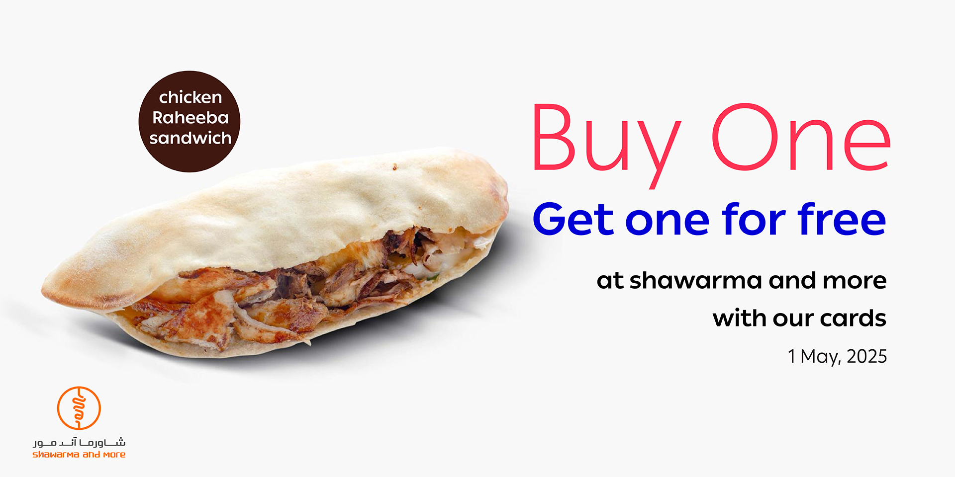 - Buy chicken raheeba sandwich and get the second one for free at shawarma and more Branches.