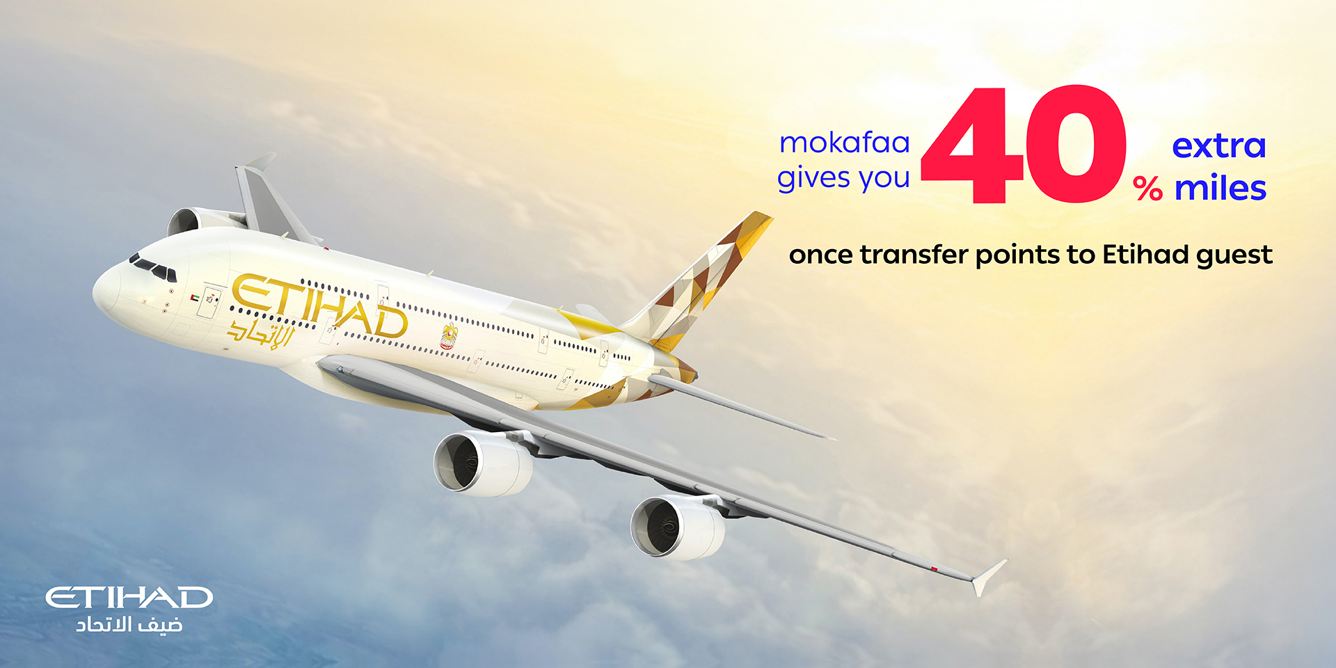 Transfer mokafaa points to Etihad Guest Miles and you'll receive up to 40% bonus Miles