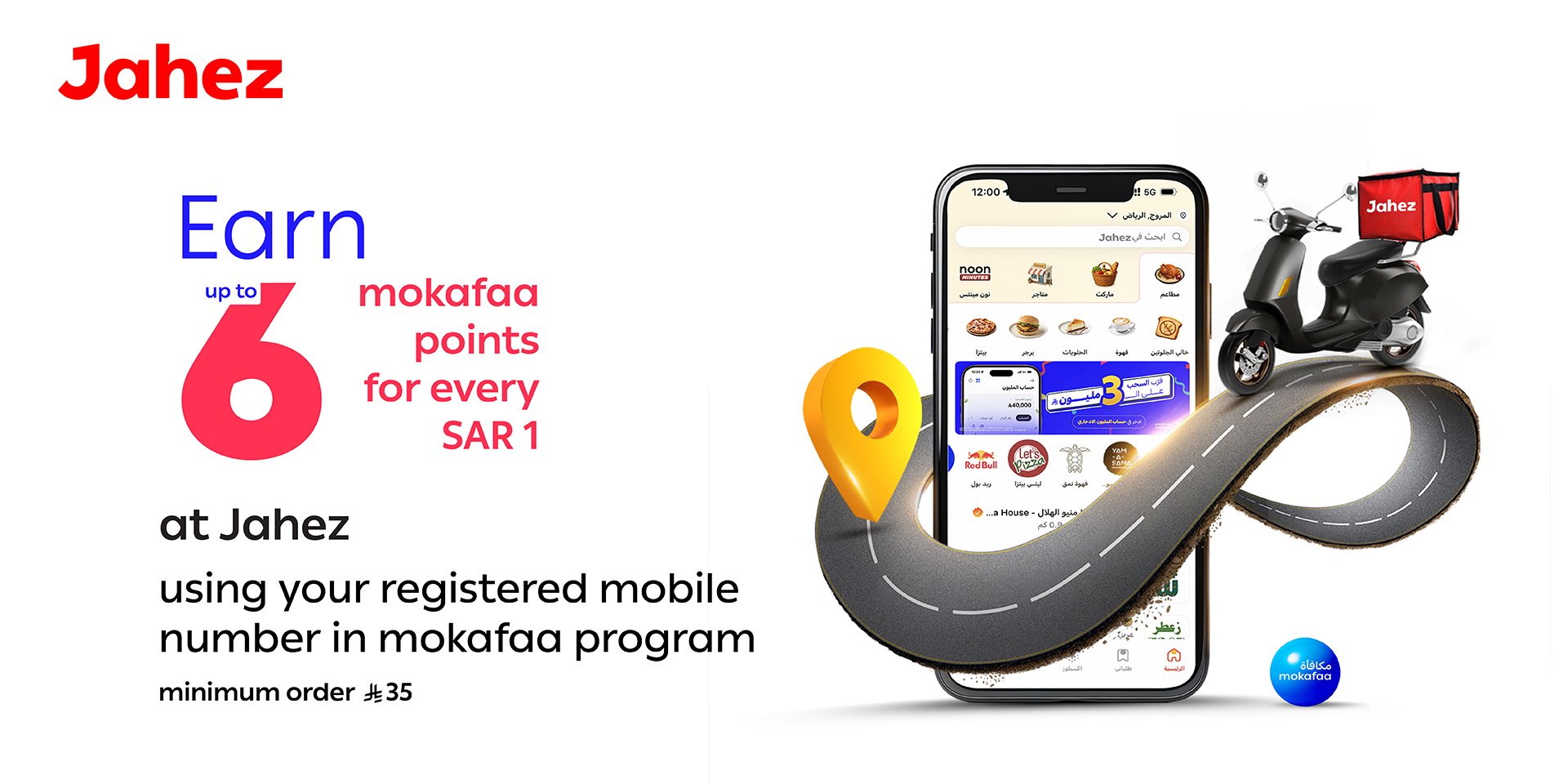 - Earn up to 6 mokafaa points for each 1 SAR Spent at Jahez App: (For a minimum order of 35 till 99 , the customer earns 2 point per 1 SAR) , (For orders of 100 till 149, the customer earns 4 points per 1 SAR) , (For orders of 150 or more, the customer earns 6 points per 1 SAR).