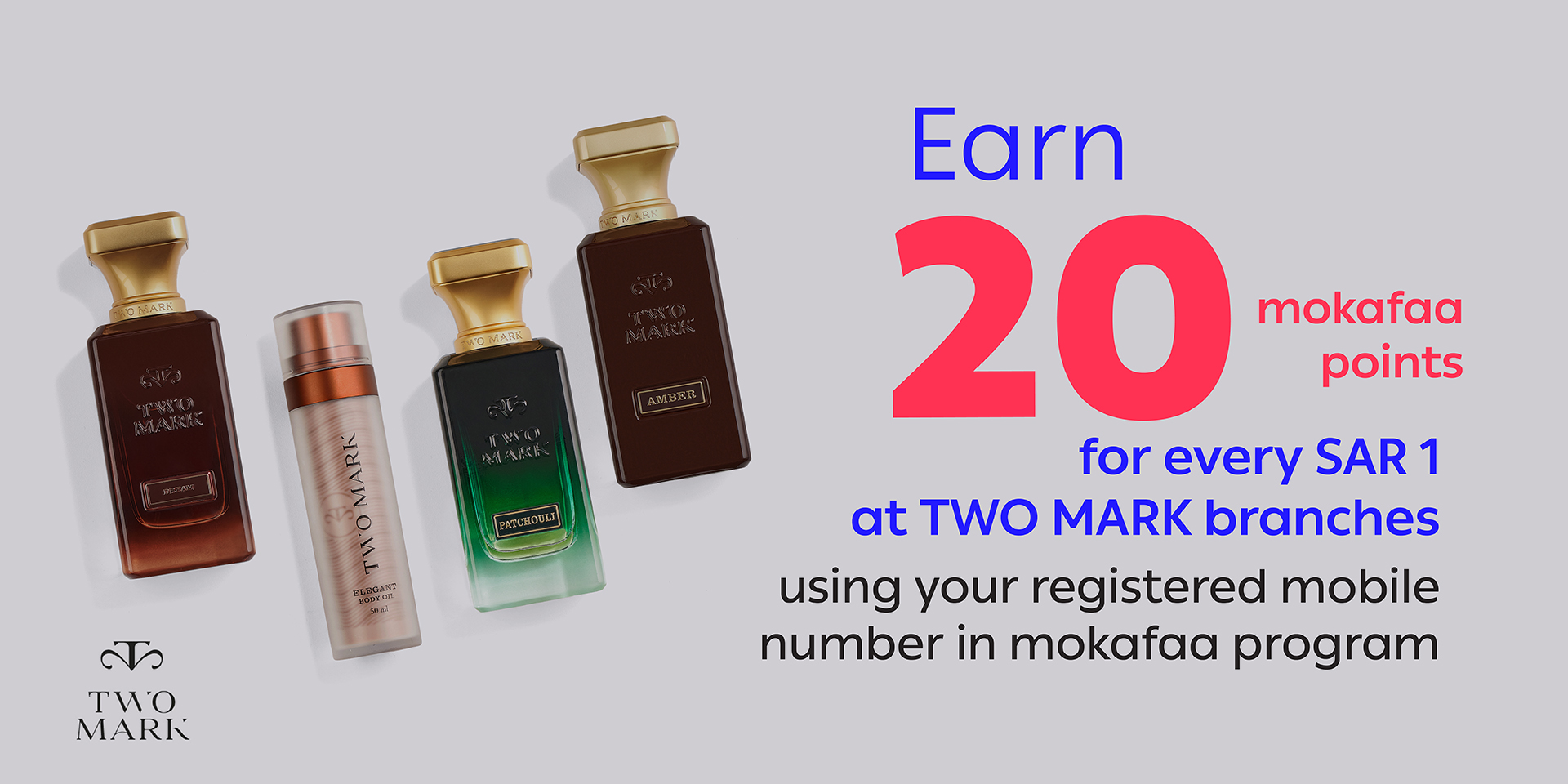 - Earn 20 mokafaa points for each 1 SAR Spent at Two Mark Branches using your mobile number.