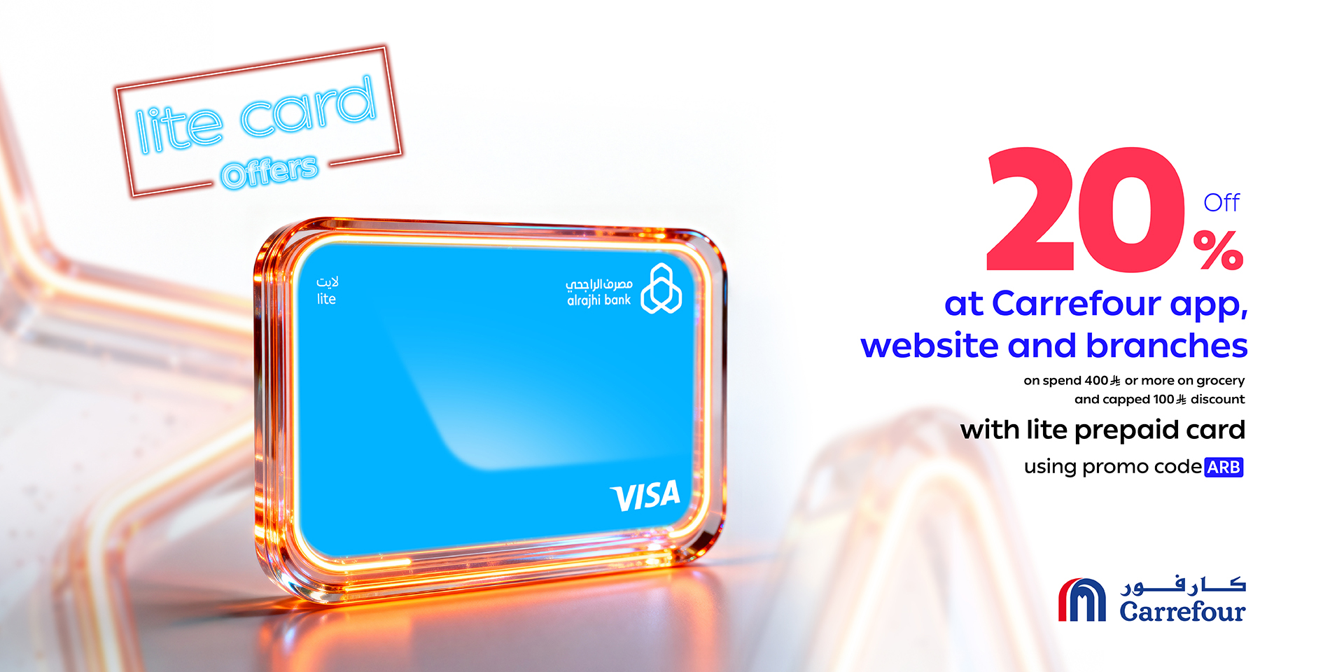 Enjoy a Discount of 20% When You Spend SAR 400 or More on grocery at Carrefour App or Website or stores using your Lite Card!