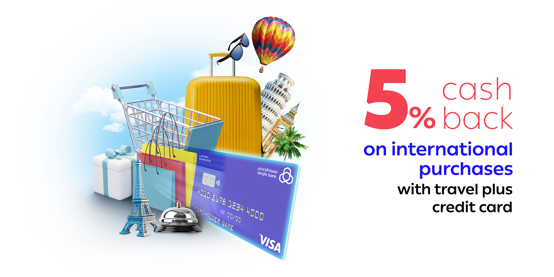 Earn 5% cashback on your international purchases, whether you’re travelling abroad or shopping online with your alrajhi bank Travel Plus card.