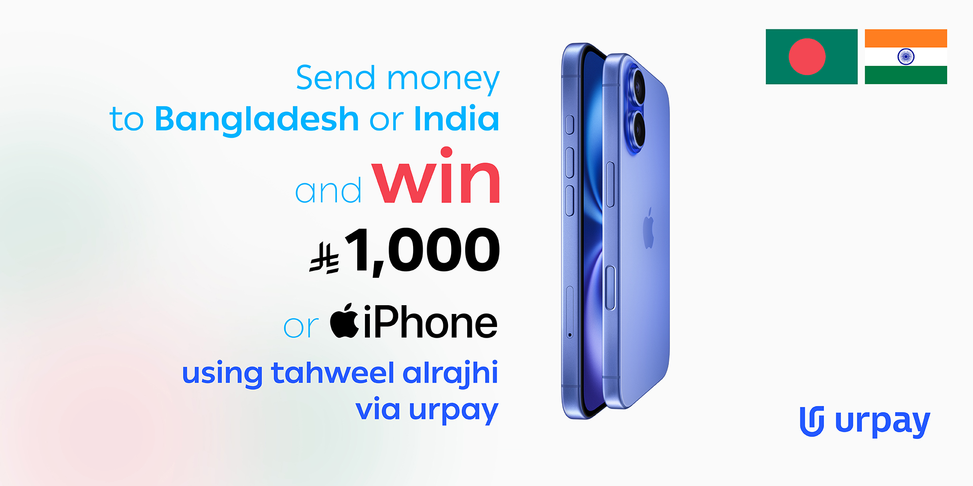 Transfer to Bangladesh or India using tahweel alrajhi via urpay and enter the draw to win 1,000 SAR or an iPhone 16!